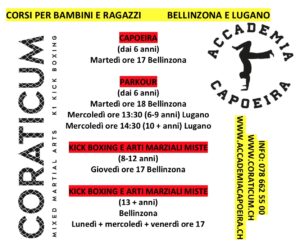 L’Accademia Capoeira propone corsi di Capoeira per bambini dai 6 anni, ragazzi e adulti. Lezioni di Capoeira in tutte le sue forme: la lotta, l’acrobazia, la danza, la musica, i canti e gli aspetti storici culturali. L’Accademia propone anche corsi di Parkour e acrobazie, Air-track, Kick boxing e autodifesa, lezioni private e campi estivi. L’accademia Capoeira vanta il raggiungimento dei primi 10 anni di attività sul territorio ticinese (Gennaio 2013-2023).